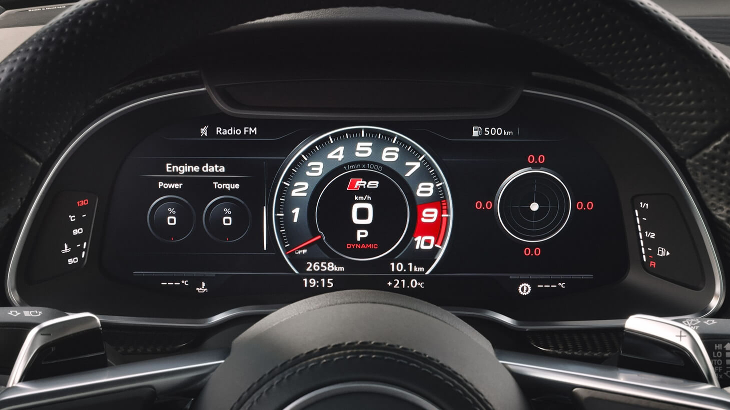 من خلال الجمع ما بين نظام MMI navigation plus وقمرة القيادة الافتراضية من Audi التي تأتي كميزة قياسية، ركّز التّصميم على جعل جميع الوظائف سهلة التّشغيل، دون الحاجة إلى رفع يديك عن المقود أو إبعاد عينيك عن الطّريق. وعلى شاشة عرض قمرة القيادة الافتراضية التي يبلغ حجمها 12.3 بوصة، ينصب التّركيز على عدّاد دورات المحرك الذي تمّ حوله ترتيب مؤشرات أخرى، على غرار مؤشر عزم الدّوران وقوّة التّسارع ومقاومة الجاذبية، توقيت اللّفات ودرجات حرارة زيت المحرك، بالإضافة إلى ضغط الإطارات ودرجة حرارتها. يوجد أيضًا زر إضافي متاح لسيارة Audi R8 Spyder V10 Performance quattro يُمكّنك من التّحكم المباشر في برامج الأداء المعدّة خصيصًا.