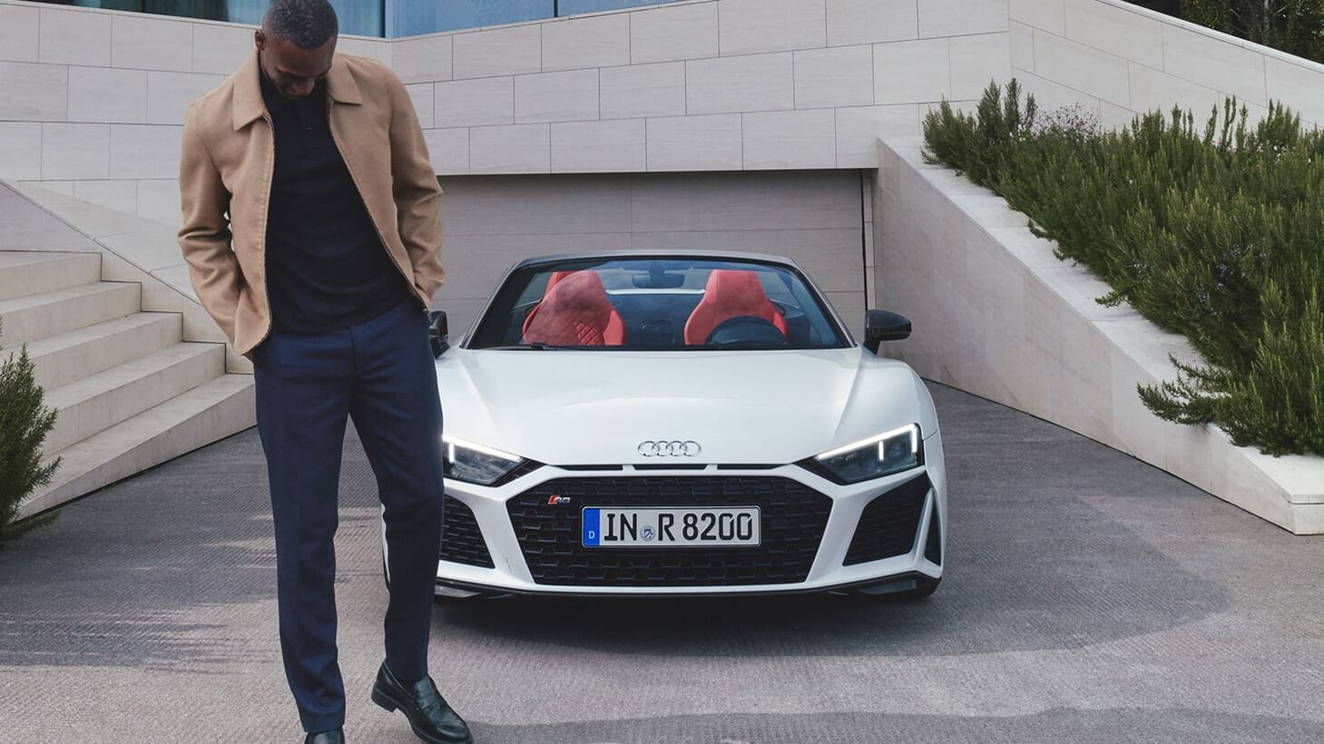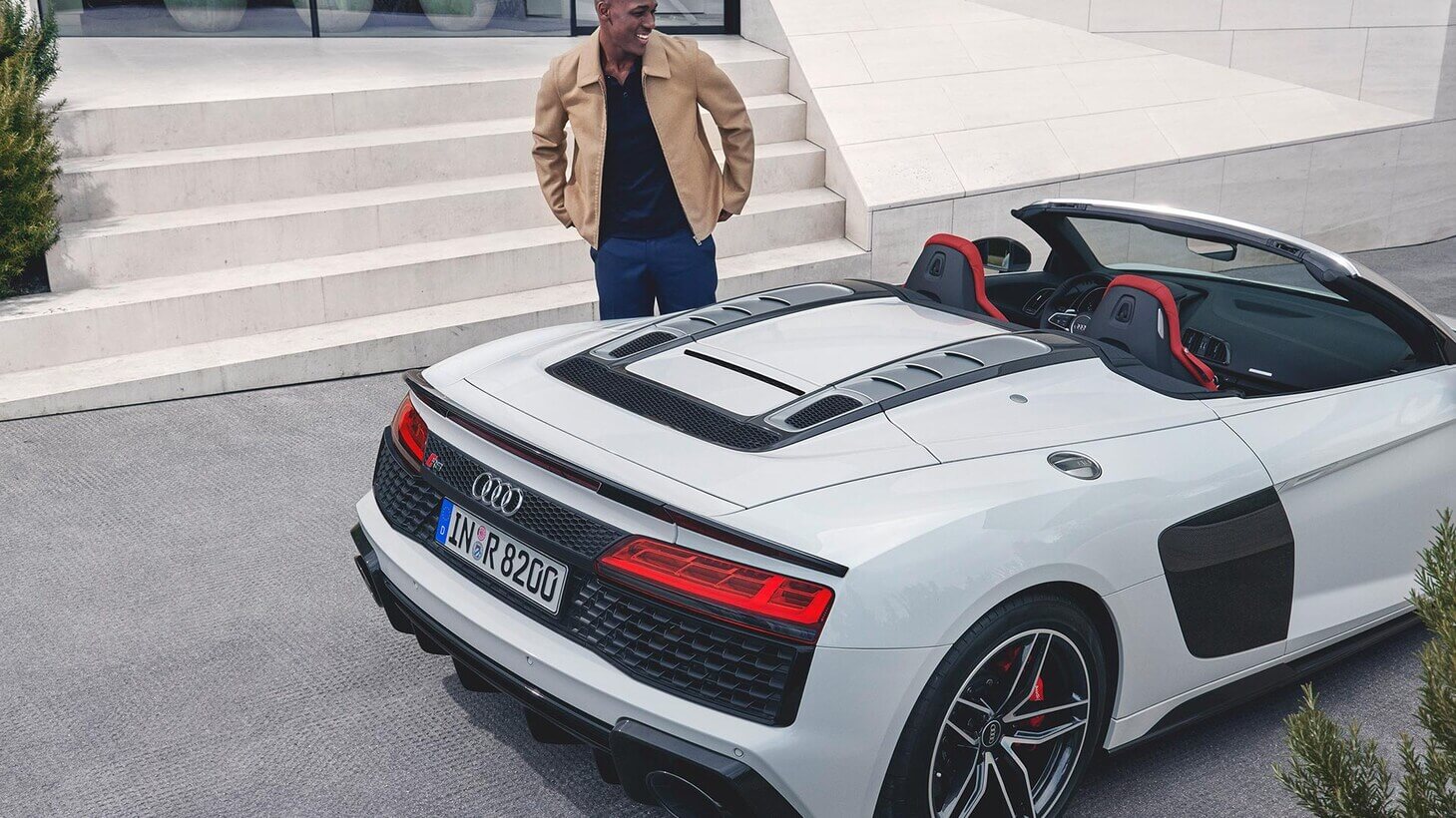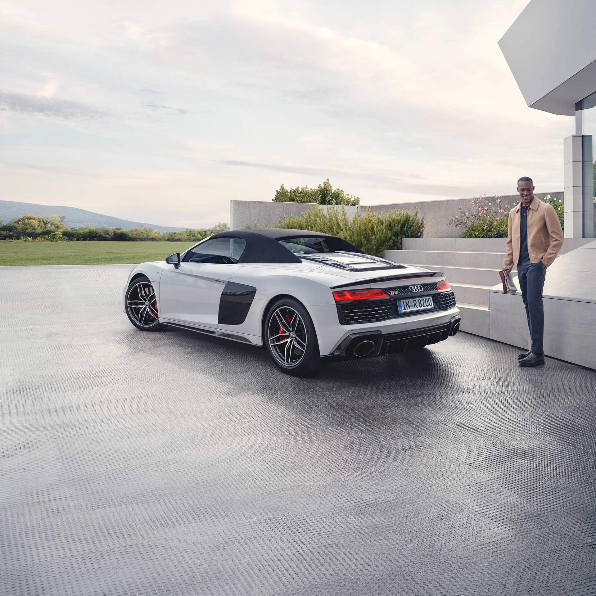 عند إغلاقه، يبرز السّقف القماشي الأداء الرّياضي العام لسيارة Audi R8 Spyder V10 Performance quattro جنبًا إلى جنب مع أقواس العجلات التي تنضح بالقوة والأخاديد المسطّحة فوق الإطار الأحادي. وتبرز الخطوط الأفقية العميقة عرض الواجهة الأمامية وتمنح R8 مظهرًا أكثر بساطةً ورياضيةً. ويوفّر القسم الخلفي بيانًا مطلقًا عن الطّابع الرّياضي للسّيارة مع ناشر الهواء المرتفع وشبكة التّهوية التي تمتد على عرض السّيارة وأنابيب العادم البيضاوية باللّون الأسود. ويمكنك اختيار استبدال العجلات القياسية مقاس 19 بوصة بعجلات مصقولة مقاس 20 بوصة حديثة التّصميم ومتوفّرة بتصميم ديناميكي يعكس شكل خمسة حروف V مع ثلاثة خيارات مختلفة للسّطح.