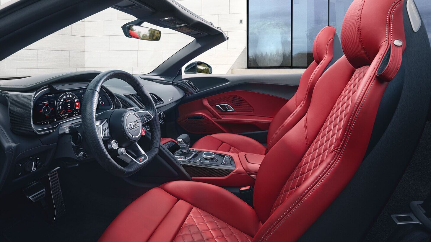 يمكن التأكد من مدى قرب Audi R8 بعالم السباقات من مقصورتها الداخلية: فأمامك مباشرة تجد قوسًا كبيرًا ومحيطًا يشمل بصريًا جميع عناصر التحكم. أما المقاعد الرياضية المدفأة والقابلة للتعديل كهربائياً وهوائياً فتأتي مكسوة بجلد نابا عالي الجودة. وبالنسبة لسيارة Audi R8 Coupé V10 quattro، تتوفر مجموعات ألوان جديدة بلا حدود لتلبية المتطلبات الفردية.
