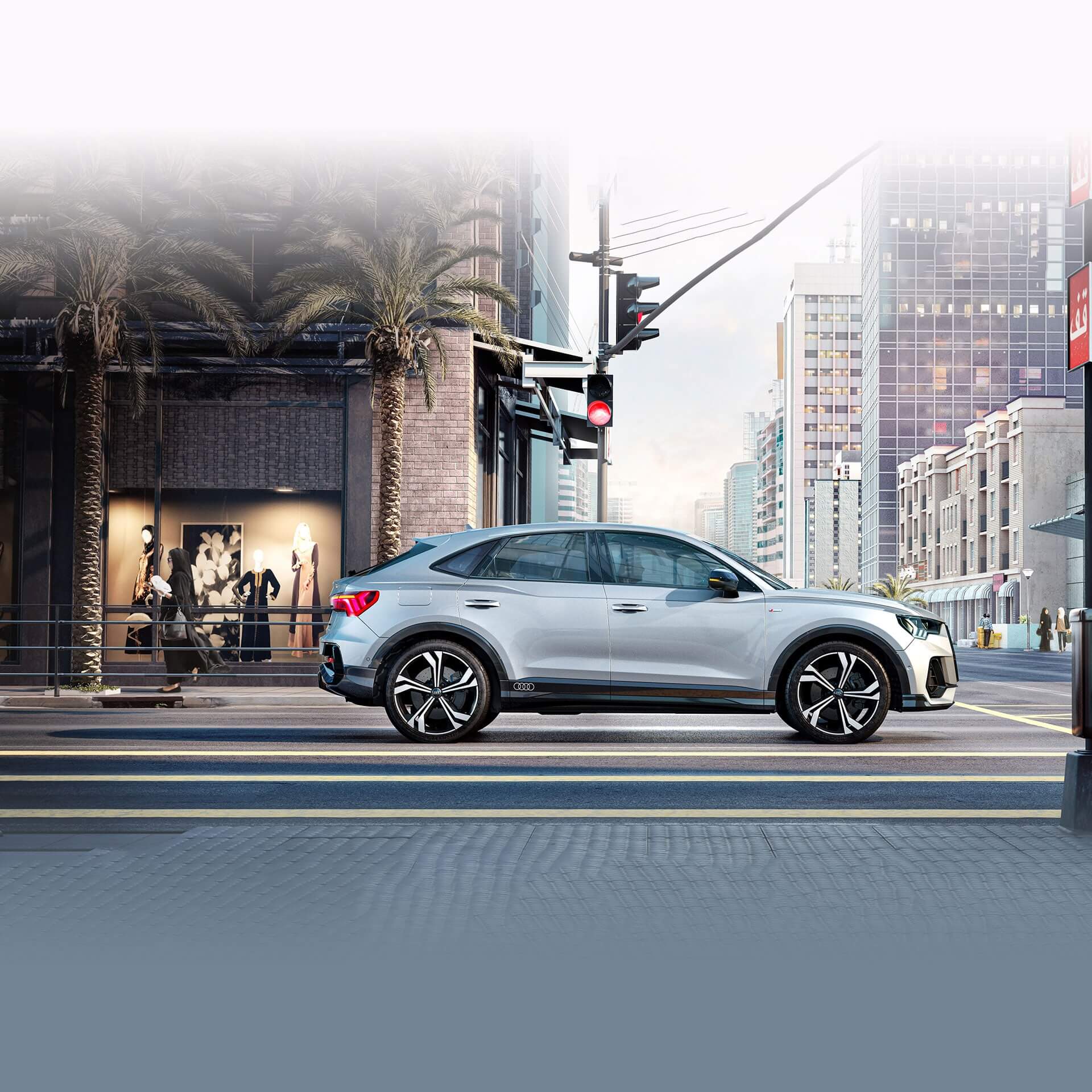 يمكن وصف سيارة Audi Q3 Sportback بأنها واثقة، منفتحة، ورياضية. يسيطرعلى الواجهة الأمامية تصميم الإطار المنفرد الكبير مع التصميم المثمن ومآخذ الهواء الجانبية. إن خط الكتف الطويل والأنيق وخط السقف المنحدر والنافذة الخلفية المنخفضة والأضواء الخلفية حادة التصميم تؤكد على طابعها الرياضي. صُمم المظهر الخارجي من خلال حزمة التجهيزات المرنة. إذا اخترت حزمة S line، فسيتم توفير Audi Q3 Sportback الخاصة بك مع مصدات ذو طلاء متباين، وعجلات 18 بوصة بتصميم 5 V البارز، وعتبات الأبواب المضيئة مع إدراج الألمنيوم الأمامي وحرف S.