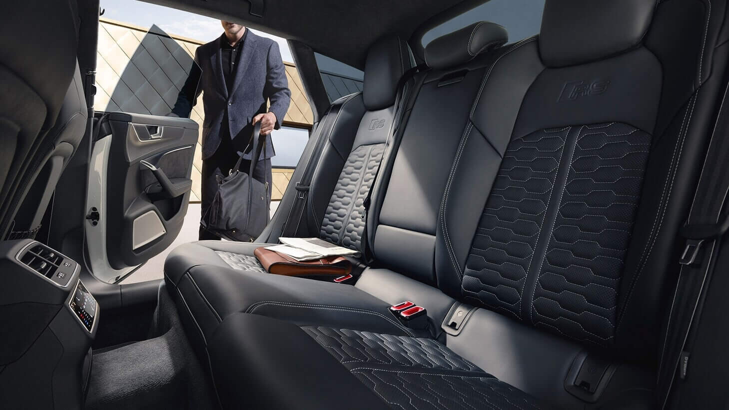 مع RS 7 Sportback يمكنك القيام بذلك وأنت جالس في مقعدك. مع مقاعد RS الرياضية المكسوة بجلود فالكونا بنمط قرص العسل الأحمر، وشعار RS على مساند الظهر وأحزمة الأمان مع حافة حمراء في الأمام والخلف. إضافة إلى مساحة داخلية واسعة ستتيح لعائلتك وأصدقائك مشاركتك هذا عالمك الرياضي. فهناك متسع كبير لما يصل إلى خمسة أشخاص لمواجهة الحياة اليومية بشكل مريح، أو الهرب إلى ملاذ من نوع خاص.