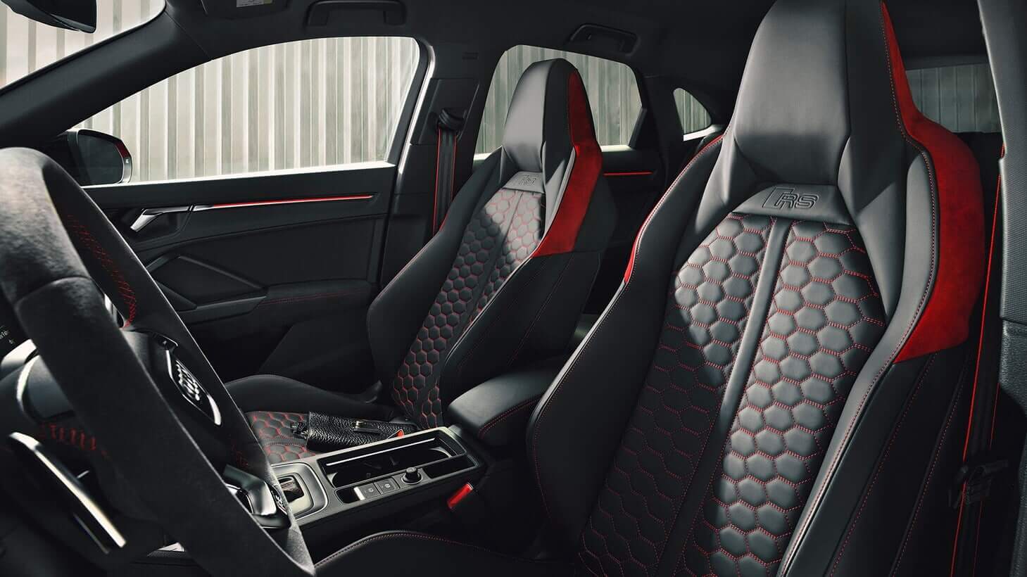 التصميم الداخلي لسيارة Audi RS Q3 Sportback مثير للإعجاب تماماً مثل المظهر الخارجي مع تصميم ديناميكي في كل التفاصيل. من عجلة القيادة الرياضية المكسوة بالجلد والمسطحة في الأسفل، بأزرار متعددة الوظائف وتطعيمات من الألومنيوم، بمظهر البيانو، أسود أو بنسيج التويل الكربوني، إلى المقاعد الرياضية الأمامية الاختيارية بالإضافة إلى جلد نابا الفاخر بنمط خلية العسل، مساند رأس مدمجة ونقش RS على مساند الظهر. وإذا رغبت، يمكن أخذ الطابع الرياضي الى درجة أخرى من خلال حزم تصميم RS الاختيارية باللون الأحمر أو الأزرق.