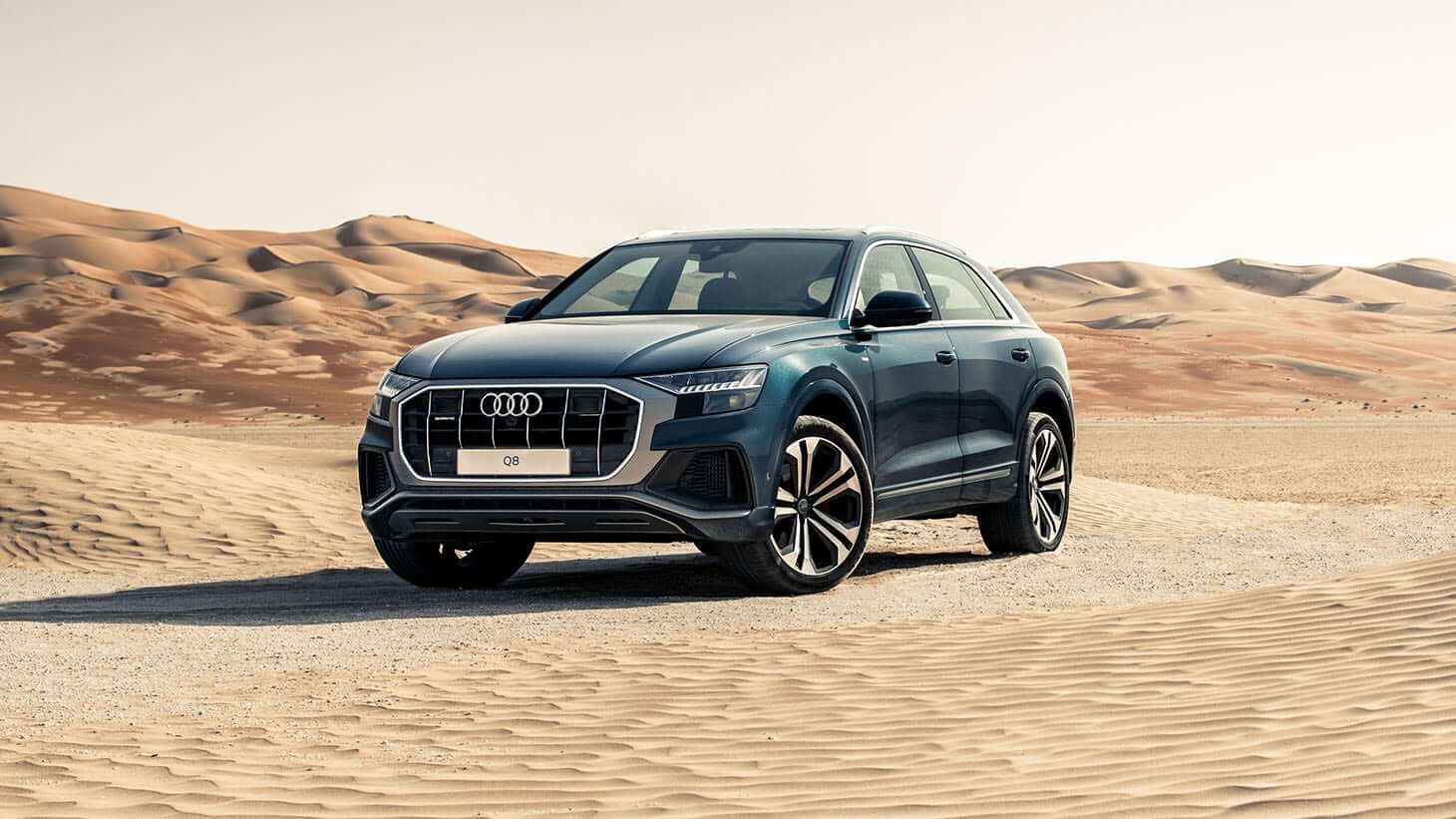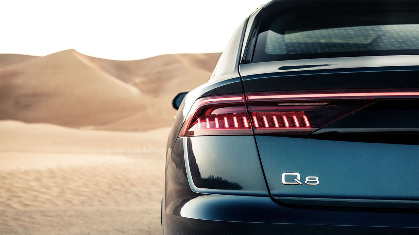 تبرز Audi Q8 ديناميكيات رياضية ومكانة راقية مثل أي SUV أخرى من العلامة التي تعتمد الحلقات المعدنية الأربع شعاراً لها. وبأبعاد تبلغ 4.99 متر طولا و2.00 متر عرضا و1.71 متر ارتفاعا، تعد الكوبيه الرياضية متعددة الأغراض أوسع وأقصر وأخفض من طراز Q7 الشقيق. وقد تمكنت بفضل قاعدة عجلات تصل إلى 3.00 متر تقريبًا من تحقيق تصميم داخلي فسيح يتفوق على منافساتها في هذه الفئة من ناحية الطول الداخلي والارتفاع. ويمكن إدخال تعديلات في موضع صف المقاعد الخلفية حسب الطلب. وعند طيها تتسع مقصورة صندوق الأمتعة الخلفية إلى 1755 لتر وهي تستفيد من باب خلفي كهربائي الفتح.