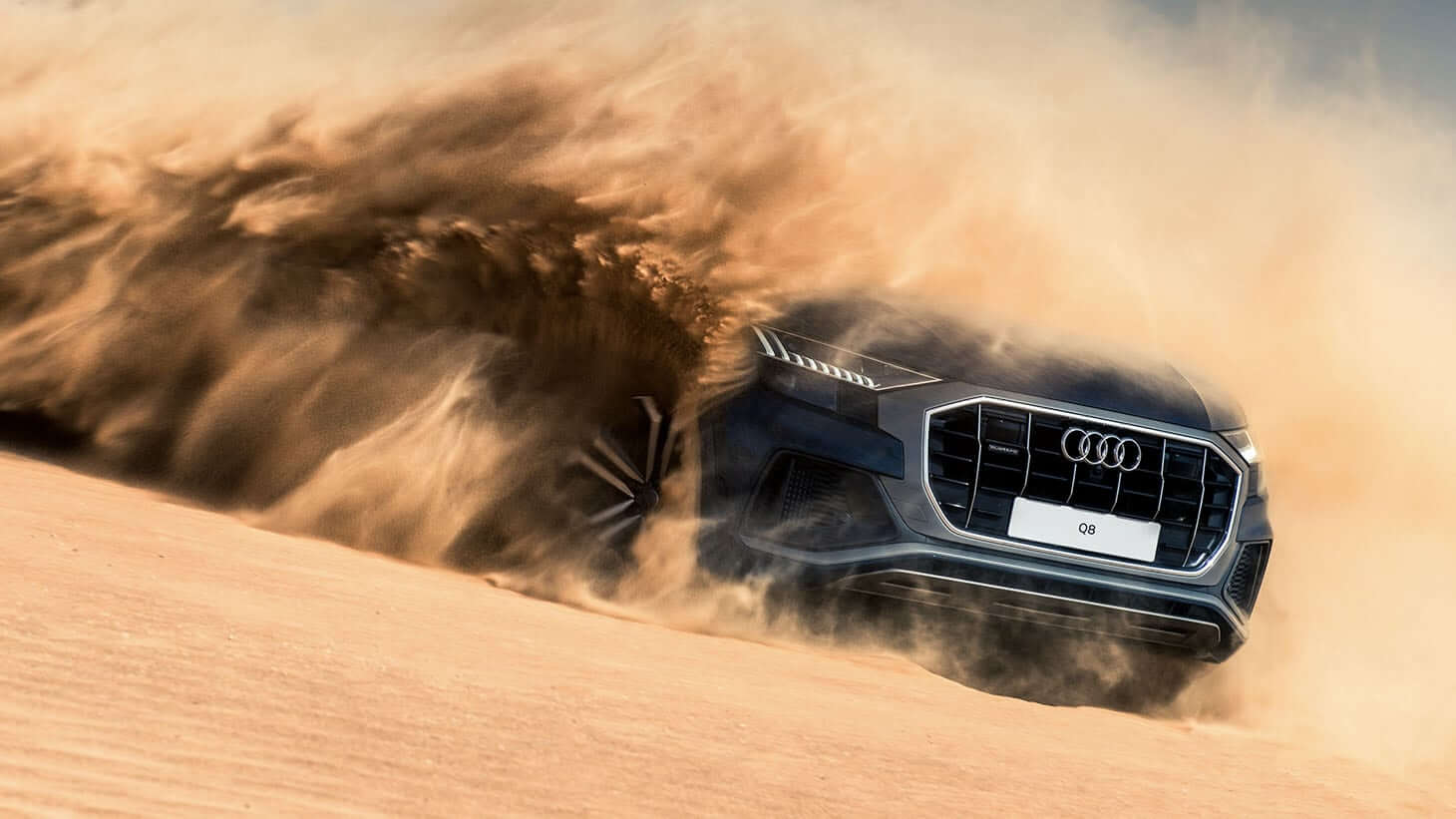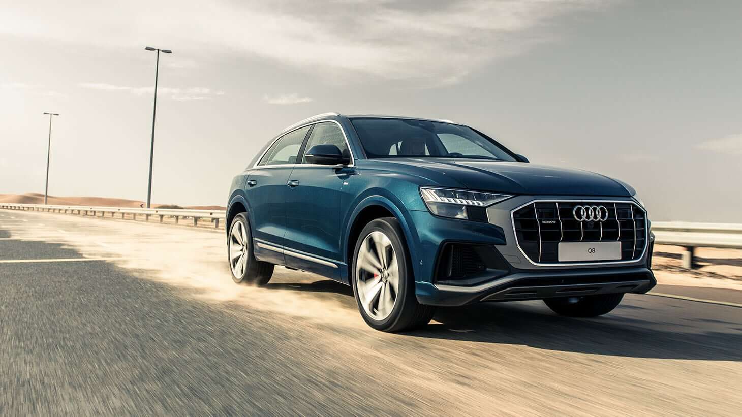 يقوم الترس التفاضلي المركزي بتحويل القوى إلى المحورين الأمامي الخلفي بنسب متفاوتة تبلغ 40:60 كمعيار قياسي. وعند الضرورة، يقوم النظام بتحويل المزيد من القوة إلى المحور ذو الجر الأفضل. وإلى جانب الارتفاع بمقدار 254 ملليمتر (10.0 بوصة) عن الأرض، ونظام المساعدة في نزول التل، يمكن لـ Audi Q8 القيادة بثبات حتى بعد انتهاء الطريق المعبد. ويأتي التعليق القياسي مع تحكم بممتصات الصدمات، في حين تقدم أودي نظام التعليق الهوائي التكيفي مع نظام التحكم بممتصات الصدمات كتجهيز اختياري مع إمكانية الاختيار من بين إعداد الراحة أو الإعداد الرياضي. وهو يقوم بضبط ارتفاع المركبة حسب وضعية القيادة وتفضيلات السائق لغاية 90 ملليمتر (3.5 بوصة).
